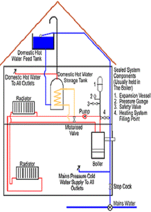 The system boiler is much the same as the heat only boiler in set up except that the heating circuit is pressuriesd so eliminating the need for a header tank in the loft. They also typically house some of the external controls and pump within the boiler unit.